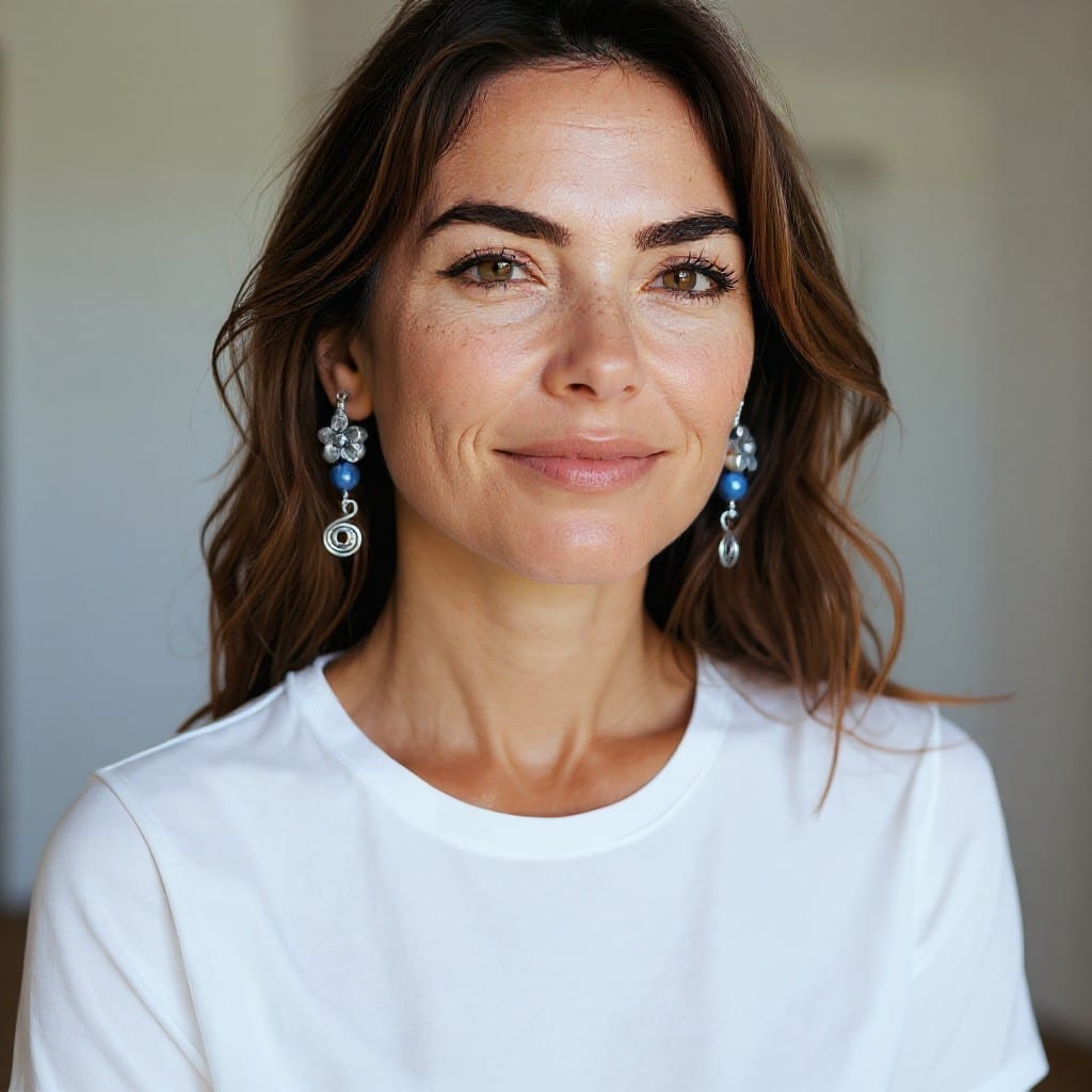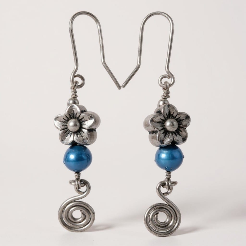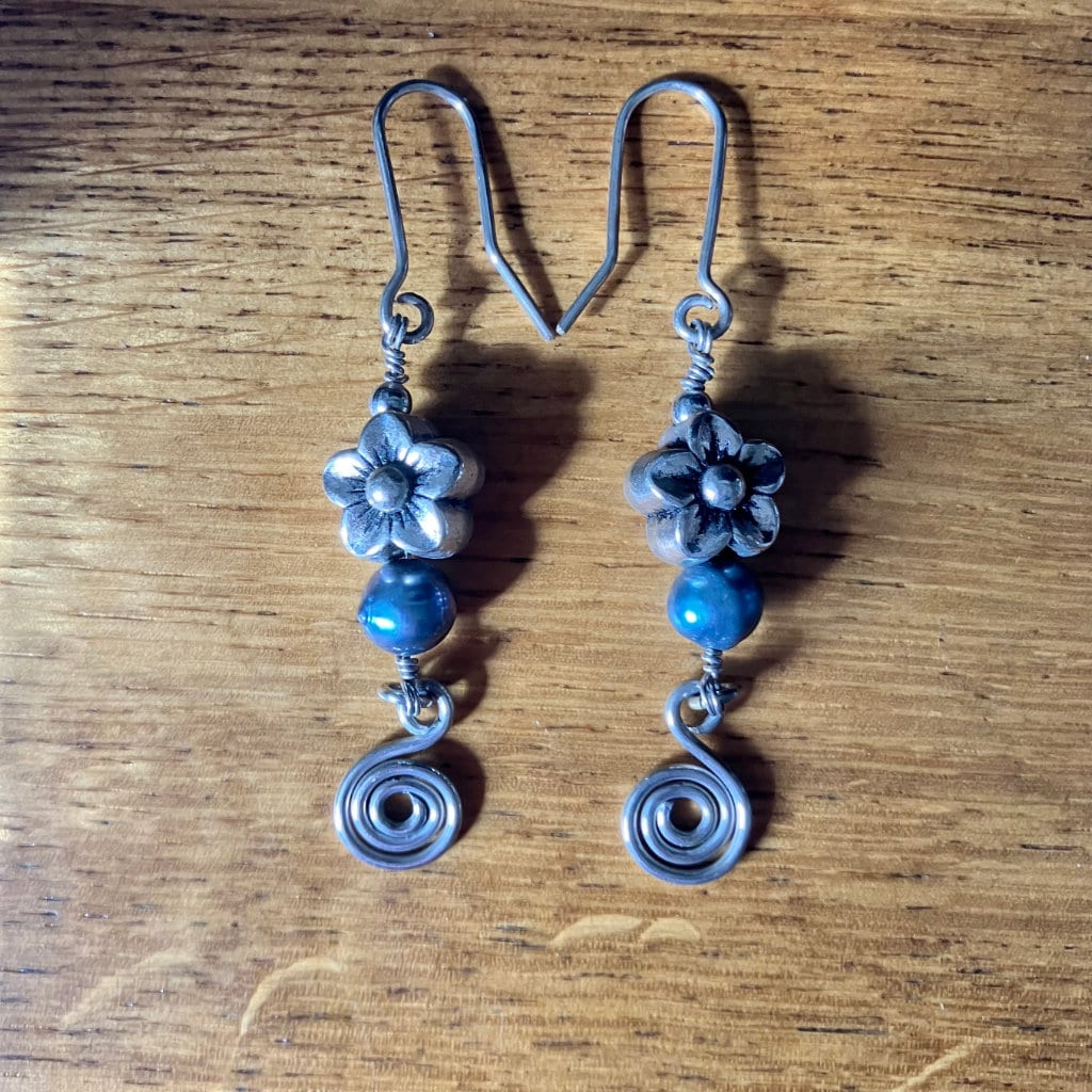 Handmade Sterling Silver – Cultured fresh water Prussian Light Blue Pearls below some silver flower beads with a hand wound spiral. 60mm long