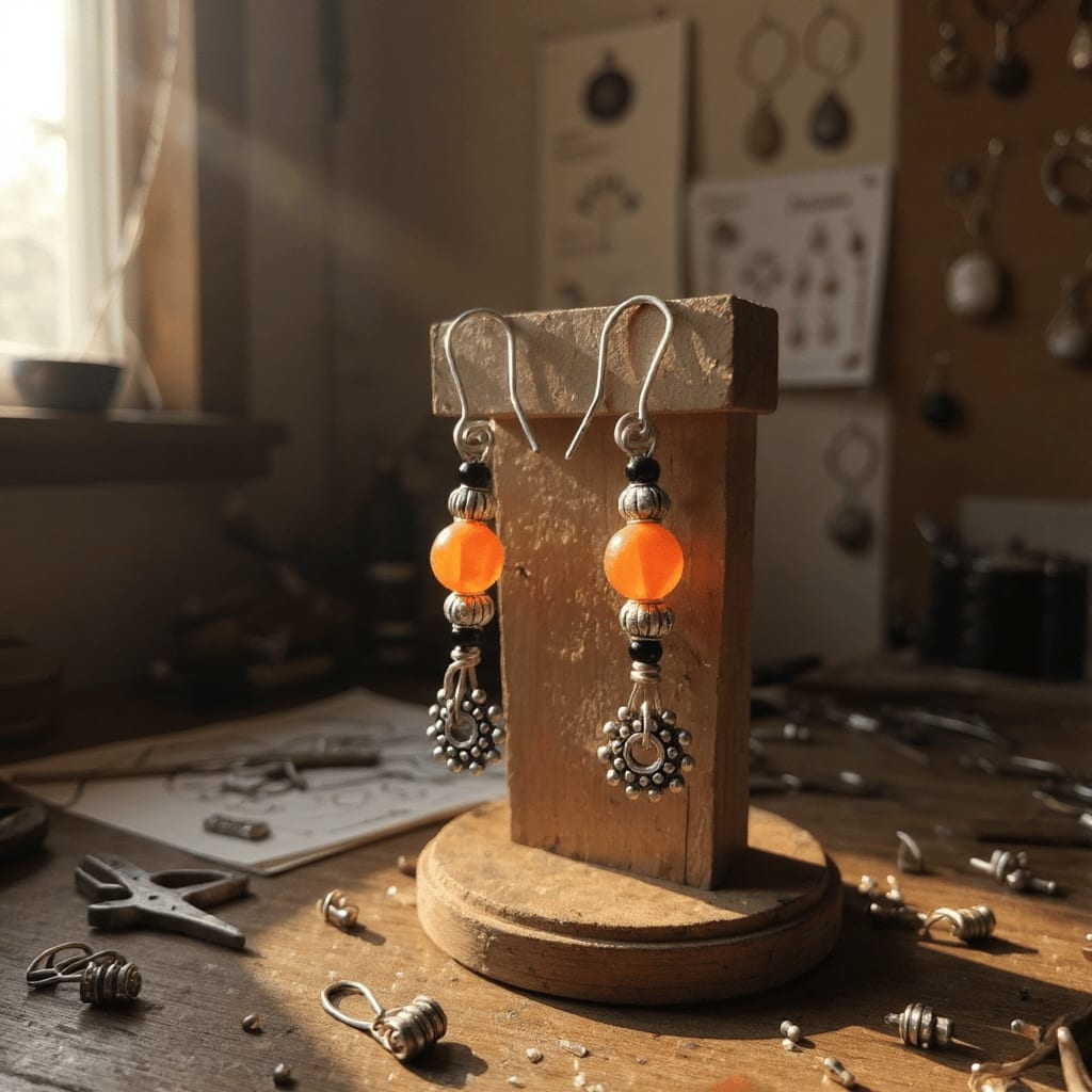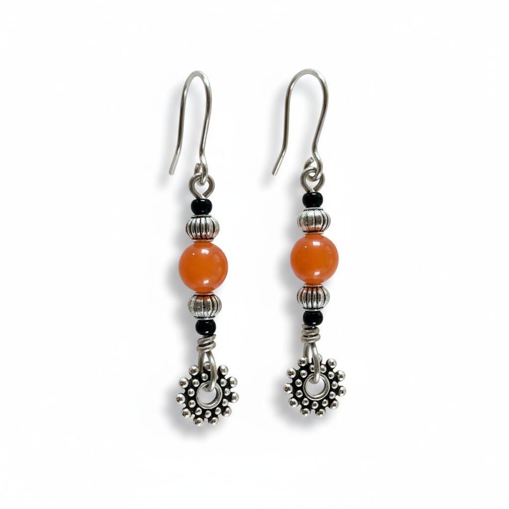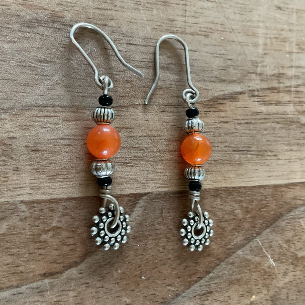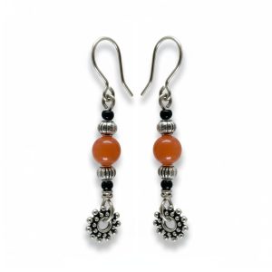 Handmade Sterling Silver – Carnelian is an orange-coloured variety of chalcedony, a mineral of the quartz family, known for its vibrant reddish-orange hues. These orange carnelian beads have small silver charms and black globes above and below , finished with a pair of decorative charms hand wound at the bottom. 40mm long.