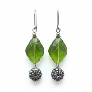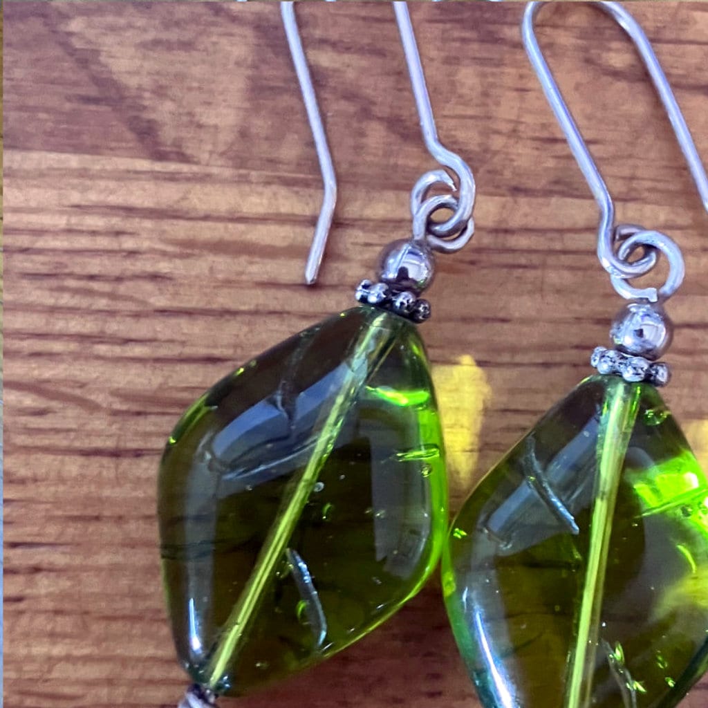 Handmade Sterling Silver – Bottle green diamond drop shape glass beads with a silver tumbler charm below. Hand wound spiral. 60mm long