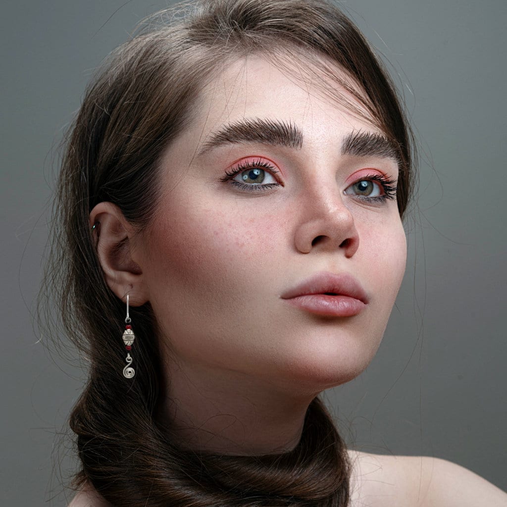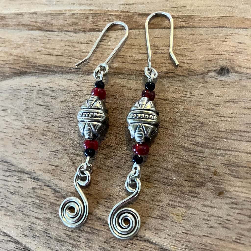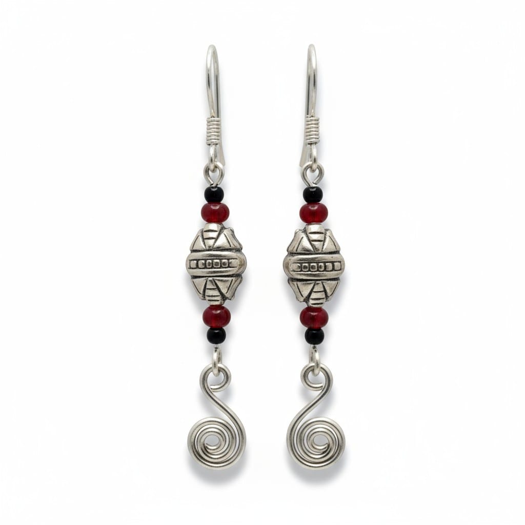 Handmade Sterling Silver – Patterned metal ornaments with small red and black beads above & below – hand wound spiral. 60mm long