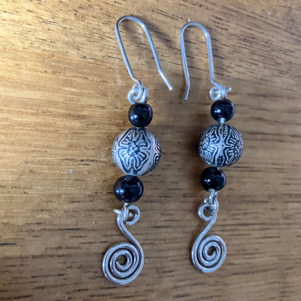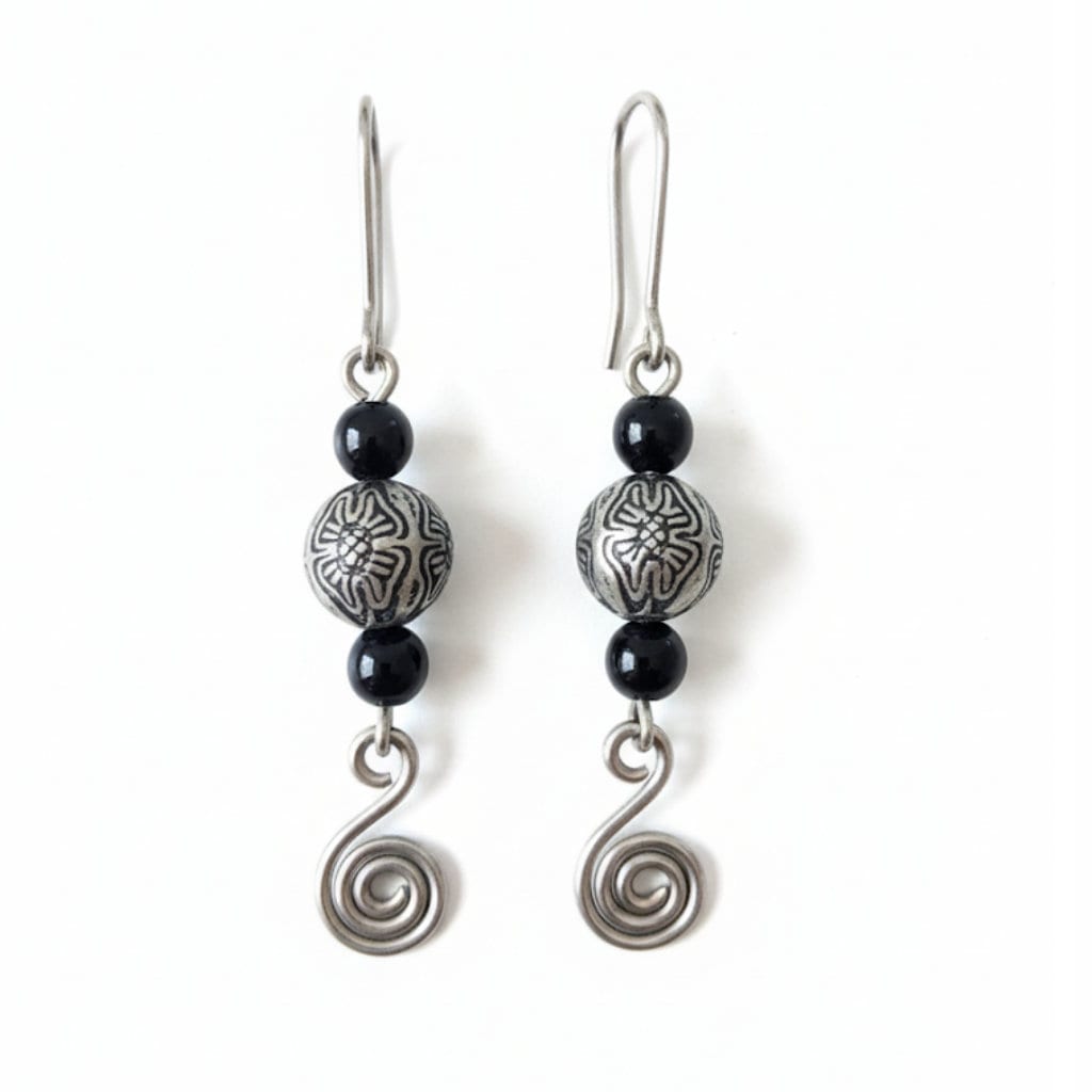 Handmade Sterling Silver – Sweet patterned silver beads with an onyx drop above and below – hand wound spiral. 60mm long
